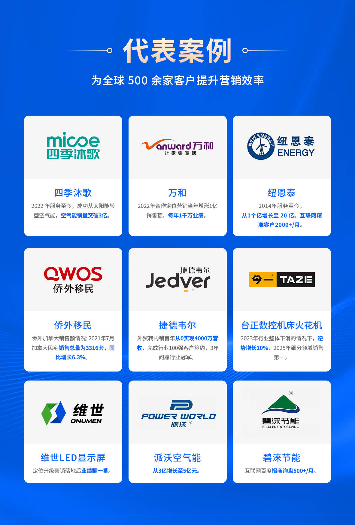 成功案例:曾助力四季沐歌实现数亿级业绩增长,为华天成提供专业策略升级服务,同时助力今一数控火花机实现数亿级业绩增长,成为行业内颇具代表性的实效案例。