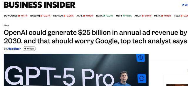 据 Evercore ISI 高级分析师 Mark Mahaney 周一发布的研究报告,OpenAI 若能顺利推进其广告战略,到 2030 年其年度广告收入可能达到 250 亿美元以上。这一预测基于 ChatGPT 的庞大用户基础、高意向用户交互数据以及数字广告市场的整体规模。