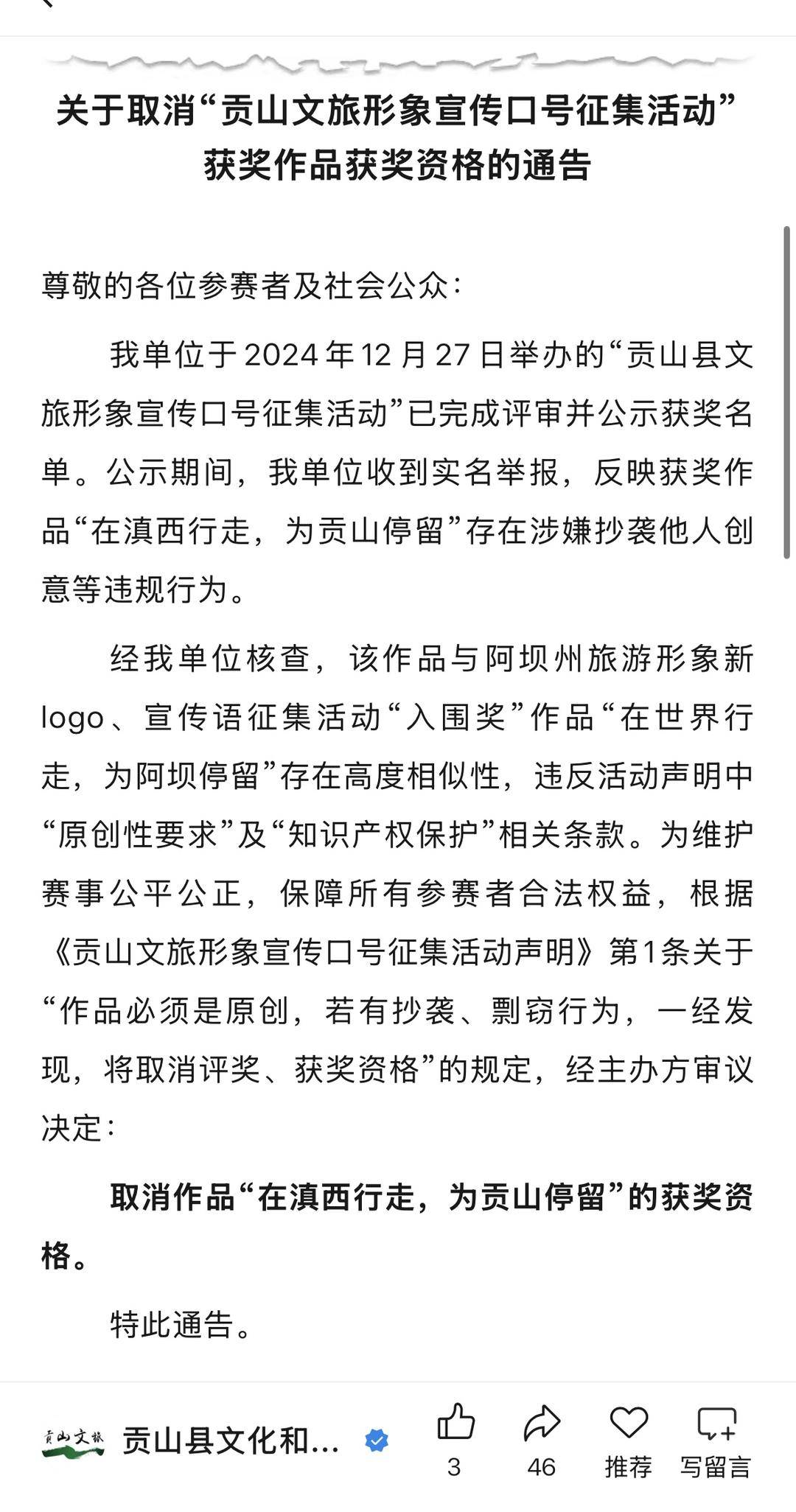 在这份声明中,贡山县文旅局介绍,该单位于2024年12月27日举办的“贡山县文旅形象宣传口号征集活动”已完成评审并公示获奖名单。公示期间,单位收到实名举报,反映获奖作品“在滇西行走,为贡山停留”存在他人创意等违规行为。经核查,该作品与阿坝州旅游形象新logo、宣传语征集活动“入围奖”作品“在世界行走,为阿坝停留”存在高度相似性,违反活动声明中“原创性要求”及“知识产权保护”相关条款。