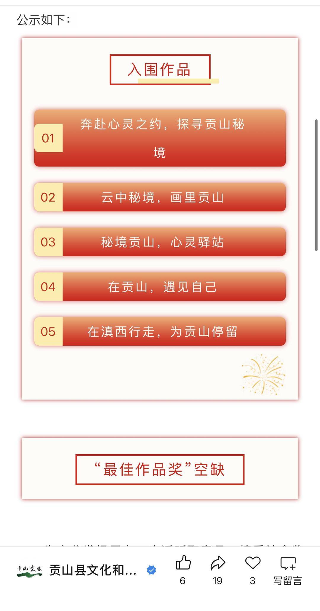 贡山县的此次活动,旨在充分展现贡山文旅的独特魅力和文化底蕴,打造具有辨识度和感染力的文旅品牌形象,活动共收到来自全国各地的投稿作品900余条。增设入围奖5名,其中,“在滇西行走,为贡山停留”在入围奖之中。