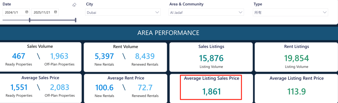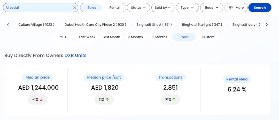 AlJaddaf区域的房产市场呈现出“量价分化、价值凸显”的鲜明特征:过去一年,区域中位数房价为124.4万迪拉姆,虽同比微降1%,但每平方英尺中位数价格逆势上涨11%至1820迪拉姆,交易总量达2851笔,同比激增71%,租金回报率稳定在6.24%。这种“交易量爆发+单价上涨”的格局,既体现了区域永久产权政策释放的市场活力,也印证了AlJaddaf作为迪拜核心区与新兴板块枢纽的价值潜力——随着立体交通与醇熟配套的持续落地,其资产的稀缺性与增值预期正不断强化,成为刚需与投资客群布局迪拜核心资产的优选板块。